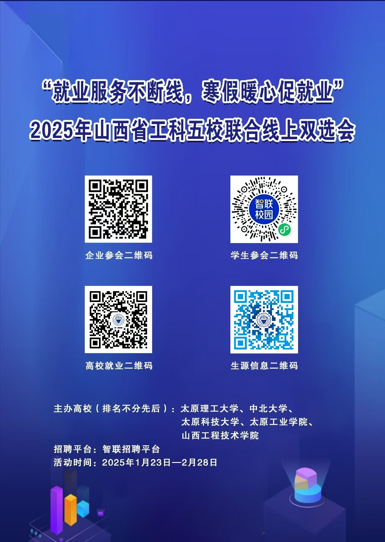 为深入贯彻落实党中央、国务院促进高校毕业生高质量充分就业决策部署,按照教育部、山西省教育厅关于做好2025届高校毕业生“寒假促就业暖心行动”相关通知文件要求,充分利用寒假窗口期,进一步利用好优质招聘平台为毕业生提供不断线招聘服务,山西省工科五校决定联合举办“2025年山西省工科五校联合线上双选会”招聘活动,全力促进毕业生尽早就业,现将有关工作通知如下: