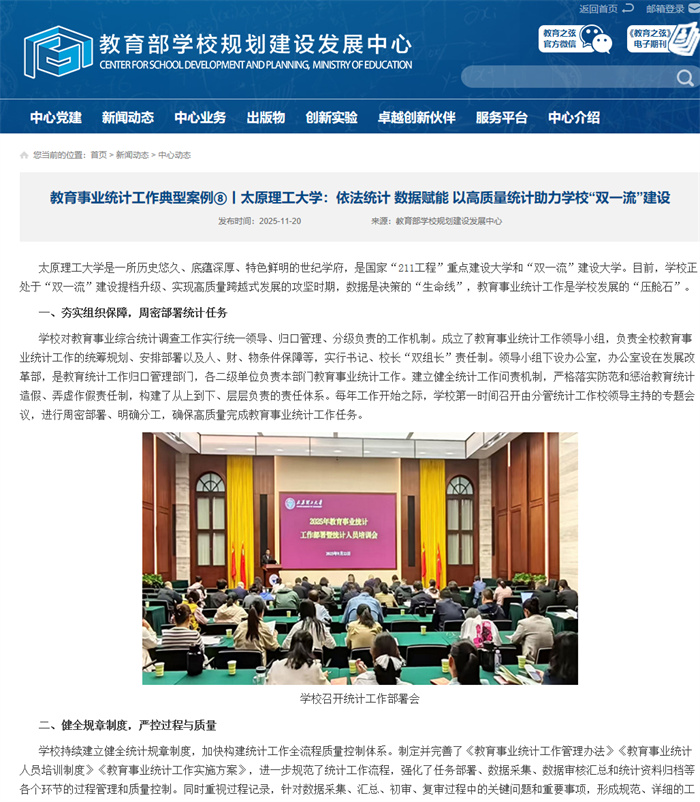 近日,我校报送的《依法统计 数据赋能 以高质量统计助力学校“双一流”建设》工作案例,经专家评审,成功入选教育部学校规划建设发展中心教育事业统计工作典型案例,获全国宣传推广。这是对我校统计工作规范化、科学化水平及服务战略发展能力的高度认可,标志着我校教育统计工作迈上新台阶。