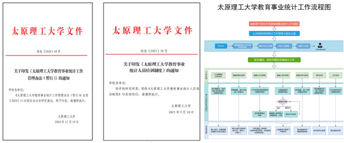 学校持续完善统计规章制度,加快构建覆盖统计工作全流程的质量控制体系。制定并出台了《教育事业统计工作管理办法》《统计人员培训制度》《统计工作流程》等,进一步强化了任务部署、数据采集、审核汇总和资料归档等各个环节的过程管理和质量控制。