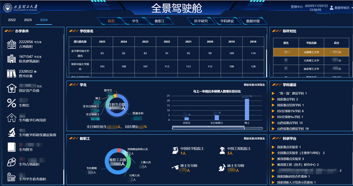 学校高度重视教育数字化建设,投入专项经费建设“双一流”建设监测统计及决策支持平台,以“破除孤岛、智能驱动、赋能决策”为目标,构建了以“数据中心”为基座、“全景驾驶舱”为中枢的一体化信息平台,为学校人才引育、学科布局、资源配置等重大决策提供支持。