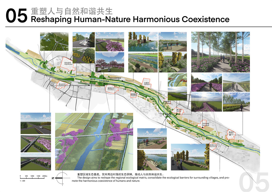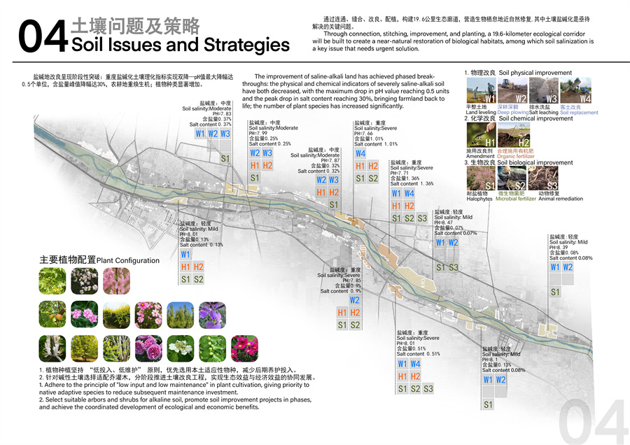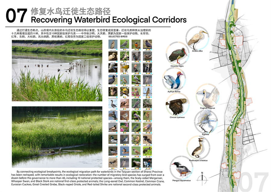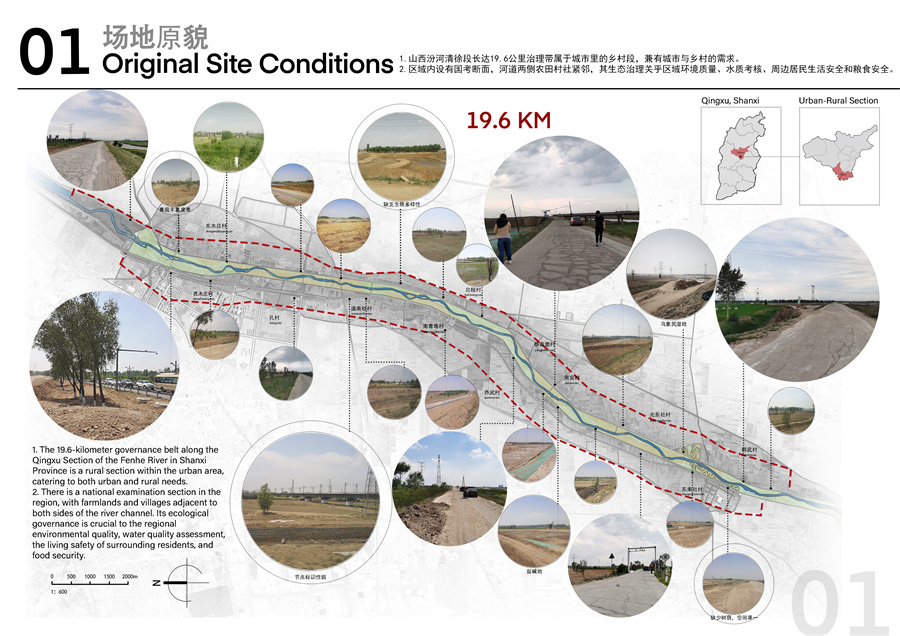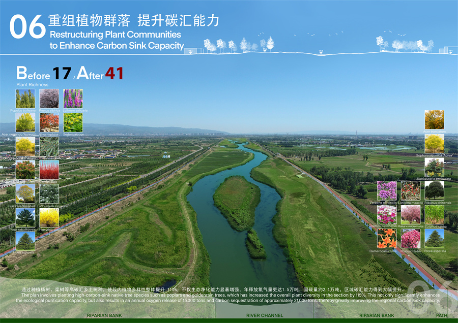 汾河干流(清徐段)堤顶路及堤外综合治理项目位于清徐县,全长19.6公里,占地面积189.82公顷。面对改造前植被稀疏、堤顶路破损等问题,该项目团队创新提出三大治理策略:构建19.6公里连续生态廊道,改良盐碱化土壤,重建水鸟迁徙路径;恢复农田生态功能,引入杨树、栾树等乡土树种构建固碳植被群落;坚持低人工干预、低维护成本的可持续运维模式。在设计过程中,我校团队充分运用了本土化的生态智慧与现代科技手段,立足于汾河流域生态保护与高质量发展的国家战略,不仅有效恢复了河岸带的自然生机,更巧妙地将三晋大地的文化元素融入景观设计之中,将昔日的河道荒滩,精心打造为一条集防洪安全、生态修复、景观休闲、文化传承于一体的综合性生态廊道,使项目成为讲述山西故事、展示中国治水智慧的靓丽窗口。