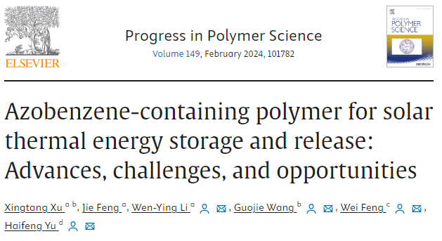 相关研究成果以《用于太阳能热能存储和释放的偶氮聚合物:进展、挑战和机遇》(Azobenzene-containing polymer for solar thermal energy storage and release: Advances, challenges, and opportunities)为题发表在顶级综述期刊《高分子科学进展》(Progress in Polymer Science)上。