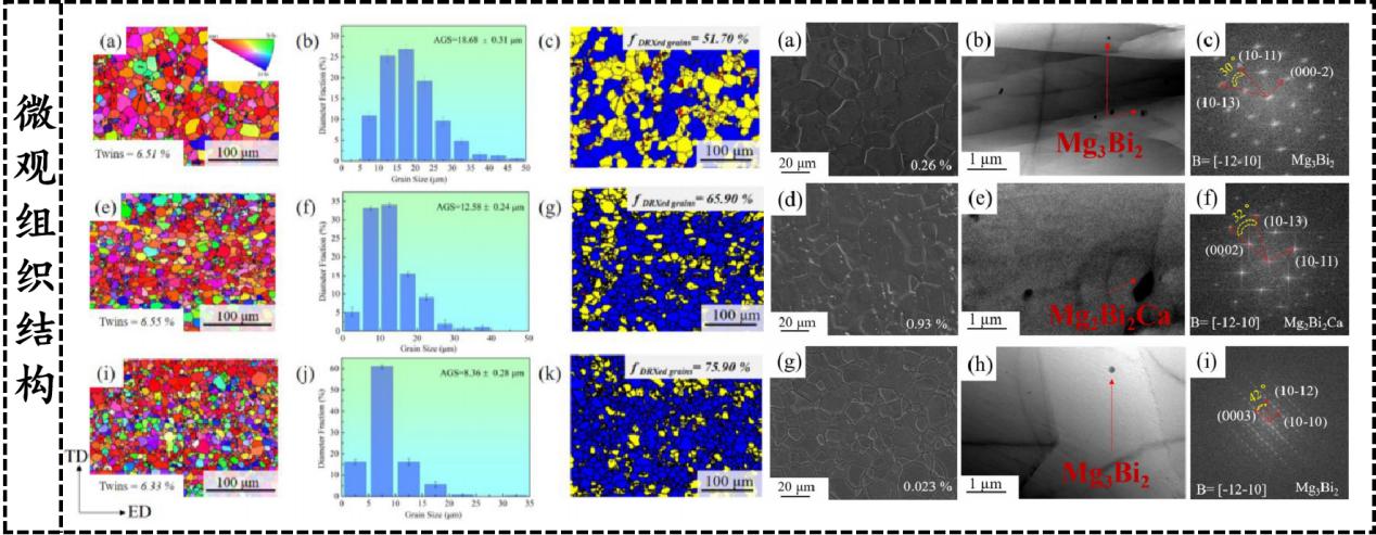 研究团队基于元素电负性和原子尺寸匹配准则,设计了异质结构Mg-Bi-Sn-Ca/In阳极材料,实现了能量密度和比容量的协同提升。Ca/In微合金化后,挤压态Mg-Bi-Sn基合金的晶粒尺寸和织构强度明显减小,形成了典型的双尺寸晶粒组织。值得注意的是,除了纳米级的Mg3Bi2相外,Ca合金化后形成了细小的Mg2Bi2Ca相(图2)。