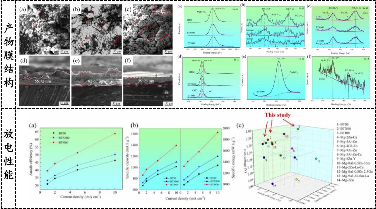 Ca/In微合金化可以提高电化学活性并效地抑制其阴极析氢动力学,导致其自腐蚀速率较低。Ca/In微合金化大大减弱了放电产物薄膜的致密性,削弱了“块效应”,在改性后的镁阳极材料活化和钝化的协同作用下,从而实现了放电电压、阳极效率和比容量的同步提升。