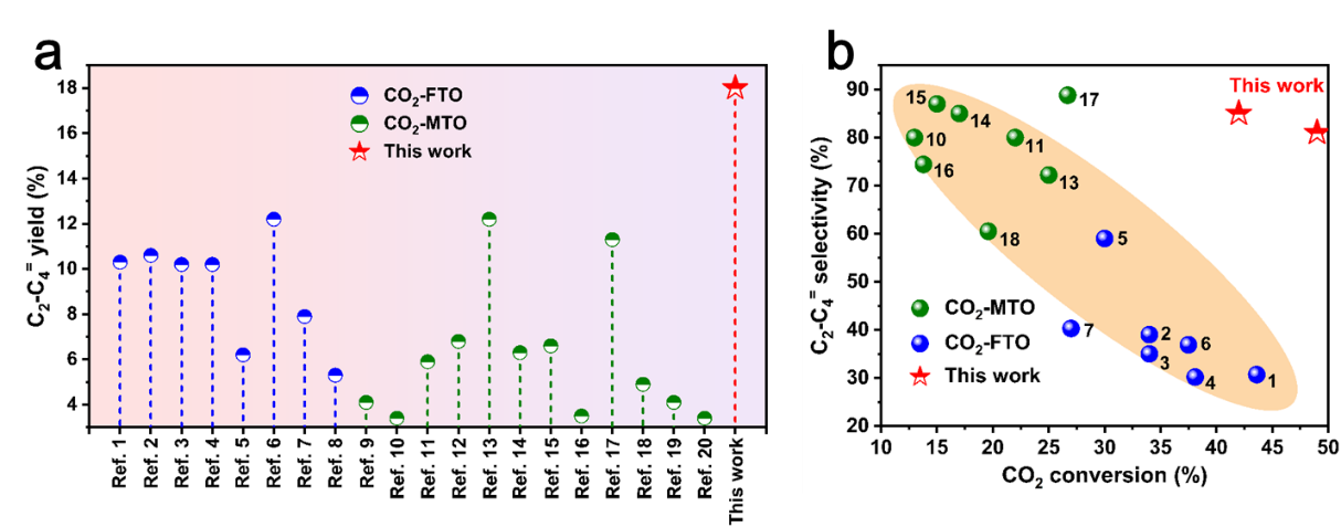 CO2加氢制低碳烯烃为高效利用CO2以及生产高附加值化学品提供有效策略。CO2加氢制低碳烯烃主要包括费托合成路线(CO2-FTO)和甲醇介导路线(CO2-MTO)。其中,CO2-FTO路线的低碳烯烃选择性较低(< 58%),而CO2-MTO路线的CO2转化率较低(< 25%),即CO2转化率与低碳烯烃选择性之间存在“跷跷板”效应。然而,由于惰性CO2分子难活化、C-C键增长过程难控以及C=C键易深度加氢等难点,使得打破“跷跷板”效应,同时获得高的催化活性和高的低碳烯烃选择性非常具有挑战性。因此,如何设计高效催化剂是打破CO2加氢制低碳烯烃中的活性-选择性“跷跷板”和实现高的低碳烯烃收率的关键所在。