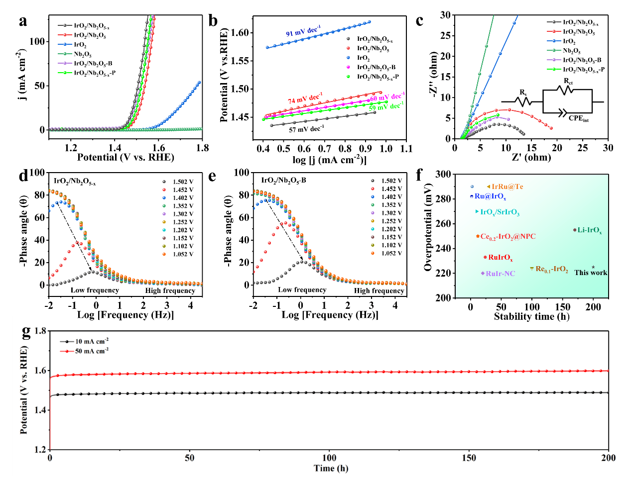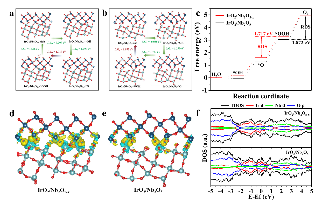 为了进一步揭示IrO2与Nb2O5-x之间的相互作用机制,进行了密度泛函理论(DFT)计算。计算结果表明,氧空位的引入显著增强了IrO2与Nb2O5-x之间的结合强度,调节了Ir的d轨道中心能级。这种能级调控使Ir的电子结构更有利于OER反应,有助于降低OER的反应能垒,从而提升催化剂的电化学性能和稳定性。这种SOSI效应不仅增强了IrO2的活性,还防止了其在高电位下的过度氧化,提高了催化剂的耐久性。