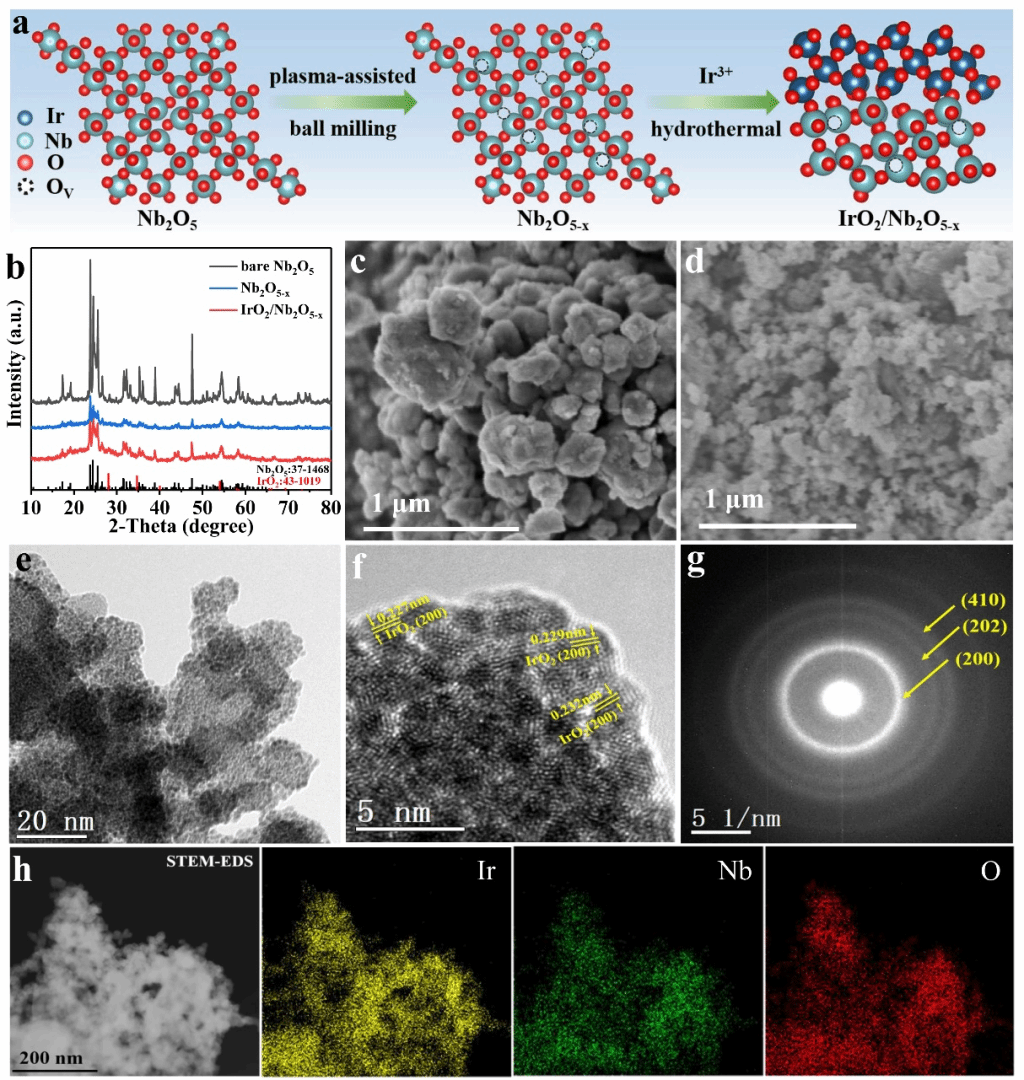 本研究采用等离子辅助方法在多种金属氧化物(包括Nb2O5-x、Ta2O5-x、ZrO2-x和TiO2-x)中引入氧空位。这一处理使得氧化物表面充满缺陷,能够为IrO2的负载提供更强的结合位点。研究通过将IrO2固定在这些富缺陷的氧化物表面上,实现了IrO2催化剂与载体之间的强氧化物-载体相互作用(SOSI),增强了催化剂在酸性OER中的稳定性和活性。