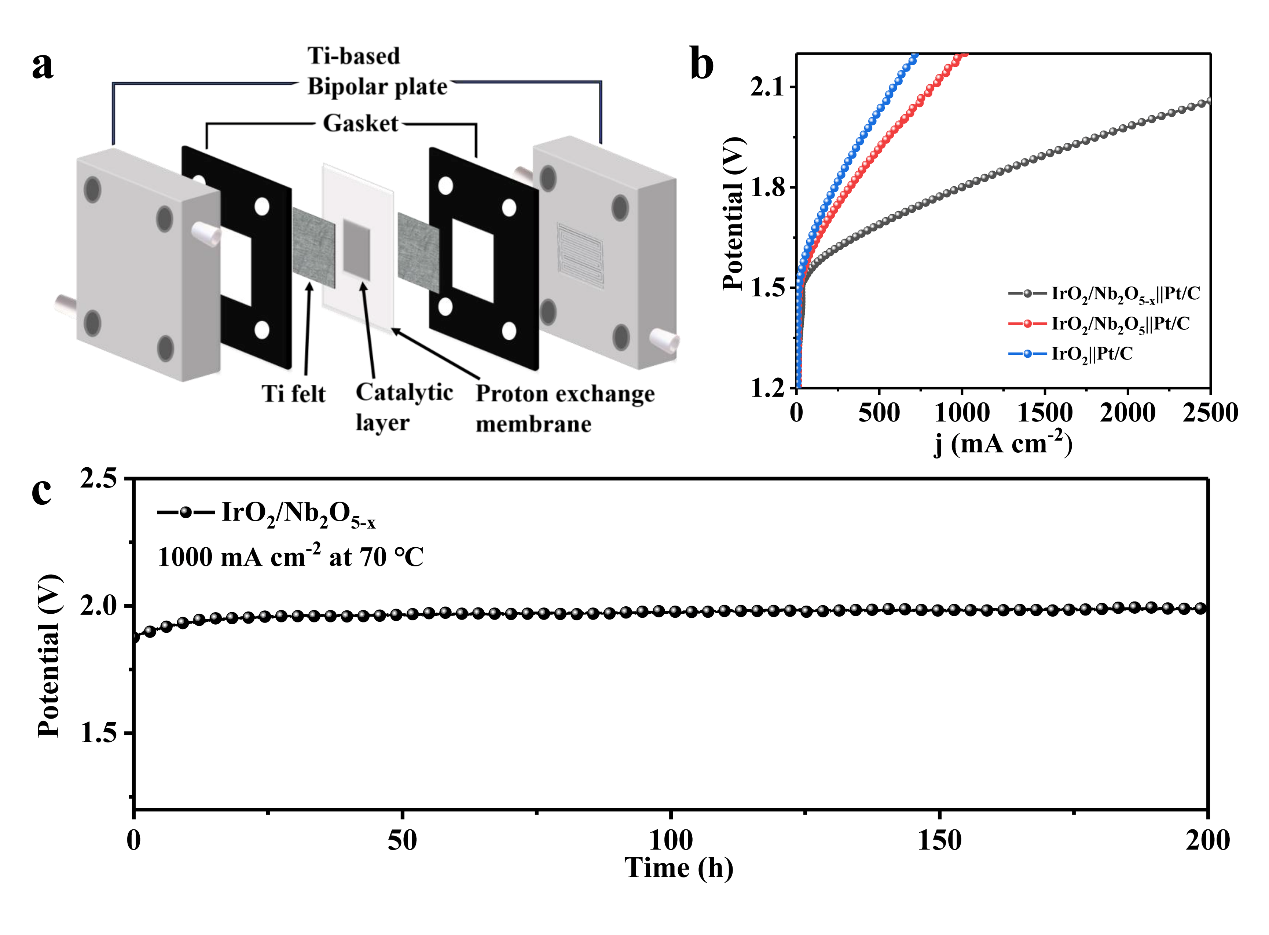 将IrO2/Nb2O5-x用作PEM电解槽的阳极催化剂进行了实际测试,结果表明,该催化剂在1000 mA cm2的高电流密度下能够稳定运行200小时。Ir负载量仅为0.2852 mg cm2,显著低于传统催化剂的负载量要求。此外,IrO2/Nb2O5-x在运行过程中表现出极低的能耗,仅为4.34 kWh Nm3 H2,大幅降低了氢气生产的能量需求。
