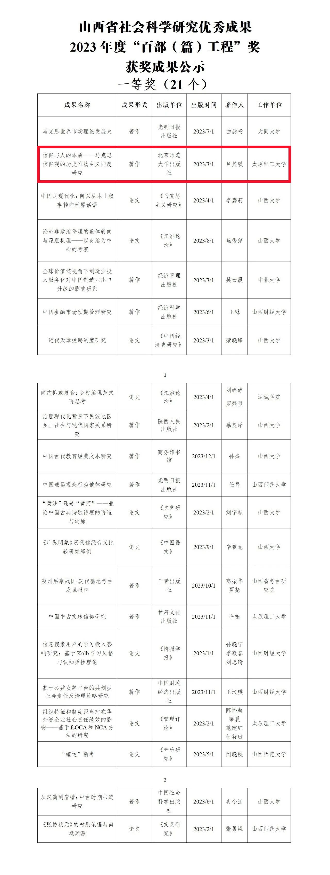 我校马克思主义学院吕其镁老师的著作《信仰与人的本质——马克思信仰观的历史唯物主义向度研究》获山西省社会科学研究优秀成果2023年度“百部(篇)工程”奖一等奖。