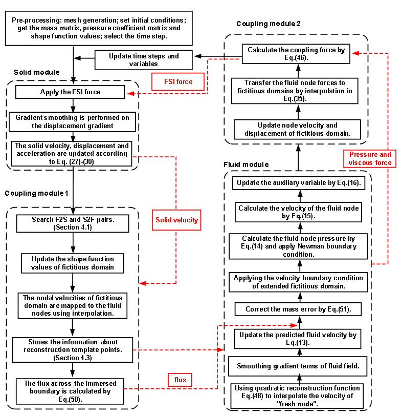 该文通过结合笛卡尔网格和光滑有限元方法,提出了一种守恒的浸没算法用于求解二维流-固耦合问题。建立了完全光滑有限元框架下的二维流-固耦合问题的数学模型,包括流体的纳维-斯托克斯方程和固体的运动方程。对流体和固体的物理量进行离散化处理,流体方程和固体方程全部采用光滑有限元方法求解,为二维流固耦合问题提供了一种有效的数值求解方法,具有较高的计算精度和稳定性。该算法不需要对流体和固体区域进行复杂的网格匹配,而是通过在各自网格上定义流体和固体的物理量,并采用浸没边界方法来处理流-固界面。将固体边界条件引入流体方程中,在流-固界面上通过界面插值的形式来完成流、固两相的信息交换,从而实现流-固耦合过程。基于笛卡尔网格的方法避免了复杂的网格生成和处理,提高了计算效率和灵活性。光滑有限元方法被用于提高计算精度和稳定性,通过对单元矩阵进行光滑处理,减少数值误差和振荡。守恒的浸没算法则保证了计算过程中物理量的守恒性。未来的研究可以进一步将该算法扩展到三维问题和复杂几何形状的应用中,从而提高算法的通用性和实用性。