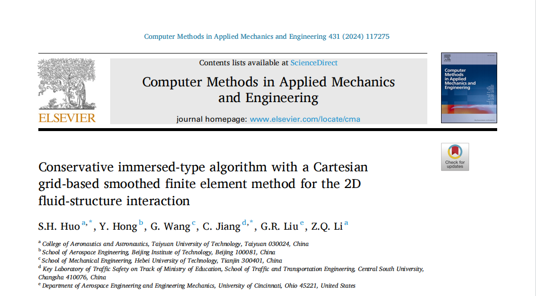 近日,我校航空航天学院李志强教授团队青年教师霍树浩在国际计算力学顶级期刊《Computer Methods in Applied Mechanics and Engineering》上发表研究论文“Conservative immersed-type algorithm with a Cartesian grid-based smoothed finite element method for the 2D fluid-structure interaction”。霍树浩老师为该论文的第一作者和第一通讯作者,中南大学姜琛副教授为共同通讯作者,北京色情小說大学洪寅博士、河北工业大学王刚教授、色情小說李志强教授以及美国Cincinnati大学G.R. Liu教授为文章共同作者。