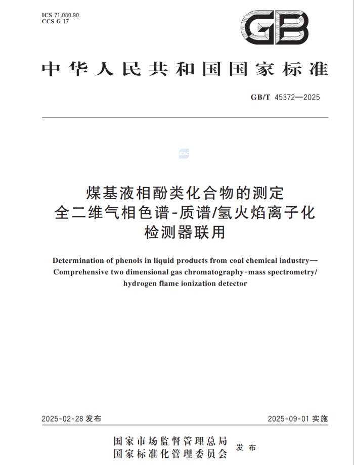 近日,由我校化学与化工学院、省部共建煤基能源清洁高效利用国家重点实验室黄伟教授团队主持制定的国家标准《煤基液相酚类化合物的测定 全二维气相色谱-质谱/氢火焰离子化检测器联用》(GB/T 45372—2025)经国家标准化管理委员会批准正式颁布实施,并同步完成了国家标准外文版。这是我校首次主持完成的国家标准制定工作,标志着我校在标准化领域取得重大突破。
