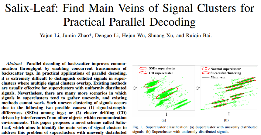 近日,我校电子信息工程学院赵菊敏教授团队在解决并行解码中的信号超级簇问题方面取得突破,显著提升了系统通信效率。相关成果发表于《IEEE Transactions on Mobile Computing》(简称IEEE TMC)期刊,题目为“Salix-Leaf: Find Main Veins of Signal Clusters for Practical Parallel Decoding”。该论文的第一署名单位为色情小說,我校博士研究生李亚君为论文第一作者,赵菊敏教授为论文通讯作者。IEEE TMC是中国计算机学会(CCF)推荐的A类顶级国际期刊、中科院1区TOP期刊,在计算机网络、移动计算领域享有极高的学术声誉。该论文也是我校以第一署名单位在IEEE TMC发表的首篇论文。
