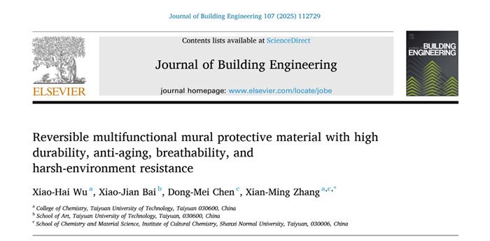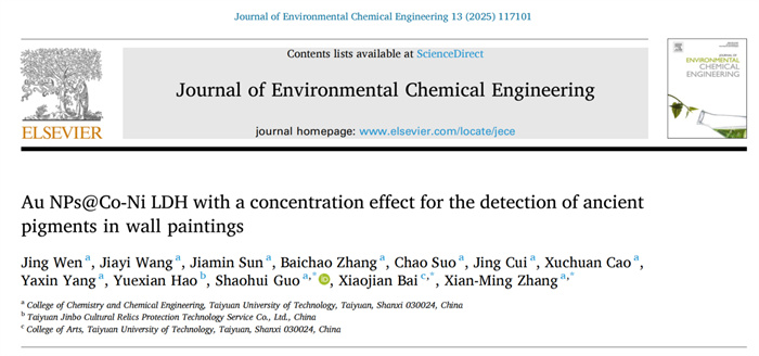 我校化学与化工学院张献明教授带领团队在文化遗产保护领域取得突破,设计了新型壁画保护材料P(HMT-Si-F)和壁画颜料成分检测材料Au NPs@Co-Ni LDH,相继在著名学术期刊《Journal of Building Engineering》以及《Journal of Environmental Chemical Engineering》上发表题为 “Reversible multifunctional mural protective material with high durability, anti-aging, breathability, and harsh-environment resistance”和“Au NPs@Co-Ni LDH with a concentration effect for the detection of ancient pigments in wall paintings”的研究论文。