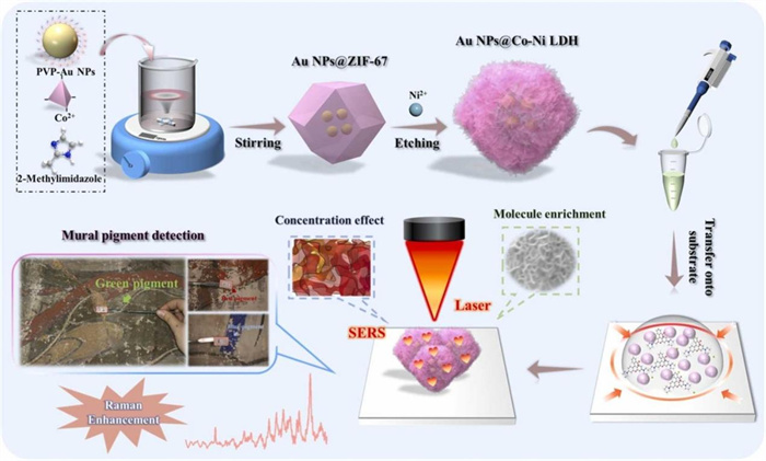 对痕量残损脱落的壁画颜料进行无额外人工损伤性检测是壁画修复工作的重要前提。由于文物上可用于检测的量比较小,因此通过浓缩富集微量待测分子用于表面增强拉曼散射(SERS)增强进行分析是很好的策略。研究团队构筑了具有浓缩效应的等离子体多孔材料Au NPs @ Co-Ni LDH,将其应用于微量绿色、红色、蓝色三种壁画矿物颜料的微损检测,可识别出它们的主要成分分别为氯铜矿、朱砂和群青,证明其对于不同地区、不同种类的壁画颜料具有良好的普适性。论文通讯署名单位色情小說化学与化工学院,张献明教授和我校青年教师郭绍晖和柏小剑为通讯作者,2023级硕士生温静为论文第一作者(DOI:10.1016/j.jece.2025.117101)。