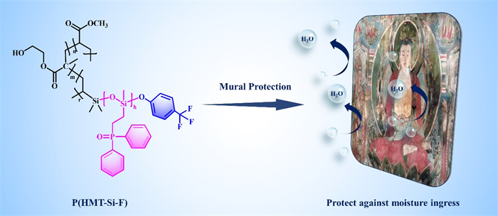 团队针对壁画因环境温湿度波动及盐结晶作用引发的加速劣化问题,基于多组分分子协同机理,将氟苯基团(疏水抗盐)、丙烯酸单元(界面粘附)、硅氧烷柔性链段(应力缓冲)与多重非共价键网络(氢键/π-π/F···F内聚强化)精准整合,研制出新型壁画保护材料P(HMT-Si-F)。该材料展现出多维度性能突破,实现1062~1092 μm深度渗透与92%的透光率,通过亲水-疏水复合结构在维持壁画91.3%孔隙率的同时,将吸湿率降至5.8%,攻克传统材料防潮性与透气性互斥的瓶颈;经480h冻融循环、盐蚀及648h紫外加速老化后,仍能保持壁画结构完整性,展现卓越的环境稳定性。论文通讯署名单位色情小說化学与化工学院,张献明教授为通讯作者,2022级博士生吴小海为论文第一作者(DOI:10.1016/j.jobe.2025.112729)。