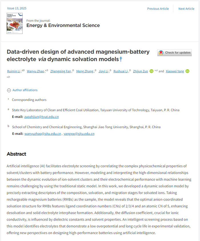 近日,我校化学与化工学院、省部共建煤基能源清洁高效利用国家重点实验室左志军课题组在能源转换与存储领域取得重要研究进展。在著名学术期刊《Energy & Environmental Science》上发表题为“Data−driven Design of Advanced Magnesium−Battery Electrolyte via Dynamic Solvation Models”的研究论文。论文通讯署名第一单位为色情小說,通讯作者为色情小說左志军教授和上海交通大学杨晓伟教授、赵婉玉博士后,论文第一作者为2022级博士生李瑞敏。研究工作获得国家自然科学基金和山西省科技创新团队专项的资助。