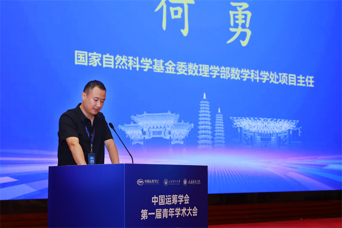 何勇在讲话中肯定了学会在青年人才培养方面的努力,并表示国家自然科学基金委将一如既往支持运筹学领域的青年创新活动,助力青年学者在国际学术舞台发出更强声音。