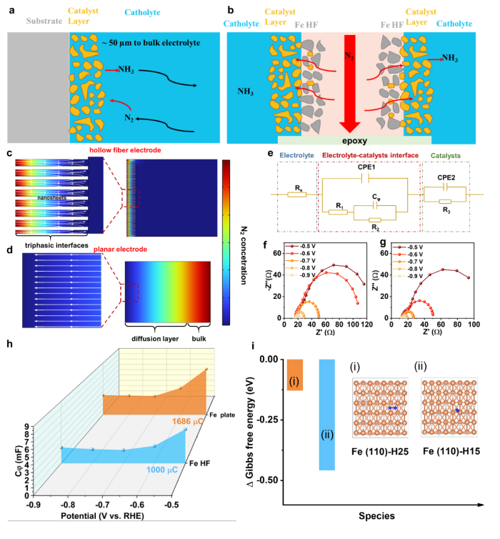 基于此,我们提出了一种通用的微纳工程策略,成功解决了电催化合成氨中N2可及性受限和*H竞争吸附的双重挑战。通过构筑自支撑中空纤维,实现了局部N2富集并优化了*N2与*H的覆盖度,从而显著促进N≡N键活化并抑制析氢副反应。其中, Fe HF实现了27.1 µg h⁻¹ cm⁻²的氨产率和3.5%的法拉第效率,其性能较Fe平板电极提升两个数量级。且该策略在Cu、Ni等过渡金属体系均表现出普适性。本研究不仅为可持续氨生产提供了可放大的电极设计平台,同时也为气体小分子催化转化的催化剂设计提供了新的维度。