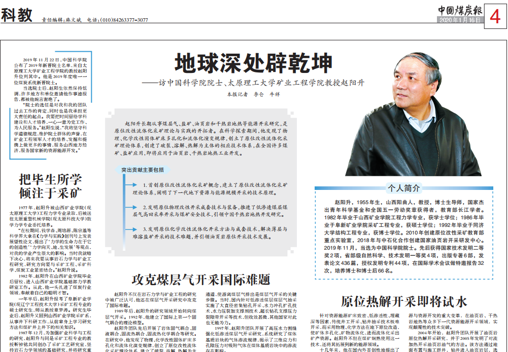 赵阳升不仅在岩石力学与矿业工程的研究中被广泛认可,他还在煤层气开采研究中攻克了国际难题。