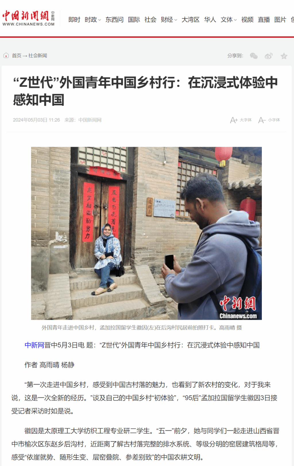 中新网晋中5月3日电 题:“Z世代”外国青年中国乡村行:在沉浸式体验中感知中国