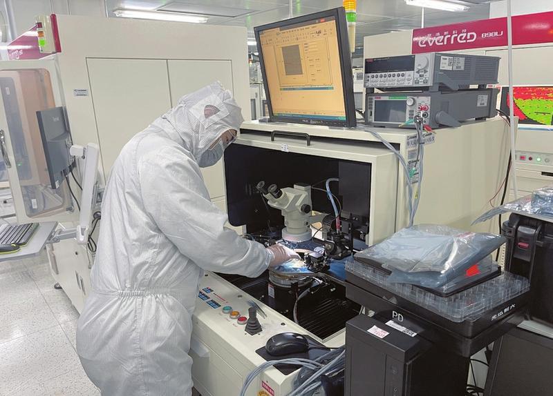 团队成员正在进行激光器芯片扎针通电实验