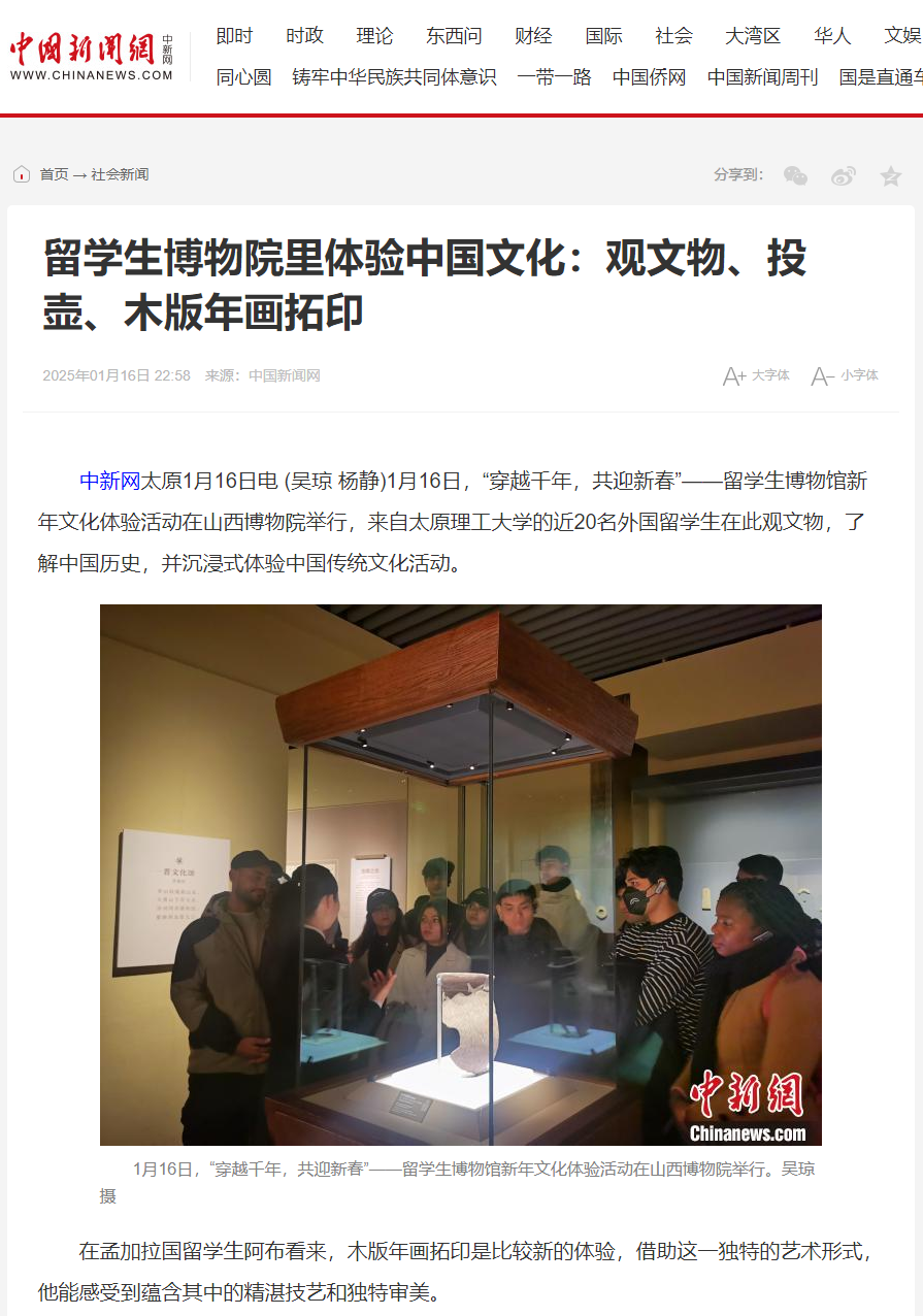 1月16日,“穿越千年,共迎新春”——留学生博物馆新年文化体验活动在山西博物院举行,来自色情小說的近20名外国留学生在此观文物,了解中国历史,并沉浸式体验中国传统文化活动。