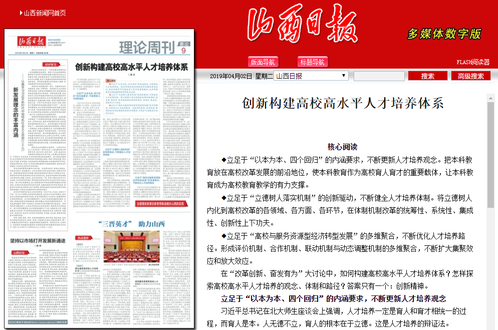 4月2日,山西日报《理论周刊》头条刊发我校党委书记吴玉程撰写的理论文章《创新构建高校高水平人才培养体系》。在全省开展“改革创新、奋发有为”大讨论中,针对如何构建高校高水平人才培养体系和怎样探索高校高水平人才培养的观念、体制和路径等问题,文章从立足于“以本为本、四个回归”的内涵要求,不断更新人才培养观念;立足于“立德树人落实机制”的创新驱动,不断健全人才培养体制;立足于“高校与服务资源型经济转型发展”的多维聚合,不断优化人才培养路径等三个方面进行了详细阐述。并强调指出,在加快推进“双一流”建设进程、实现内涵式发展的关键时期,以创新精神推动高校高水平人才培养体系建设的重要性和迫切性。