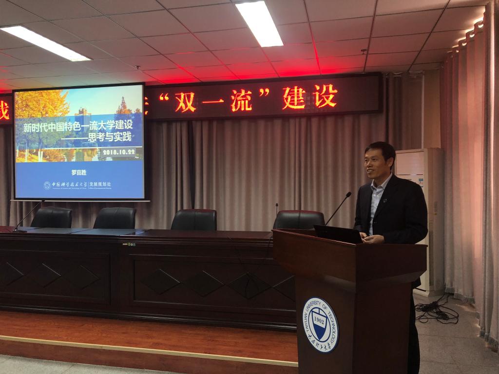 罗喜胜是中科院百人计划获得者、国家杰青,主要从事空气动力学、多相流体力学、高速粒子流及瞬态流场显示和测量方面的研究,目前主管学校“双一流”建设和重大事项推进。报告会上,罗教授从“大学之道,道在何方?——坚持还是改变”、“大学之道,道阻且长——指挥棒的作用”、“大学之道,道法其上——规划先行的重要性”及“中国科大'双一流'建设实践”四个方面,介绍了他对中国特色一流大学建设的思考以及中国科学技术大学“双一流”建设的实践与进展。同时,他还表示,非常期待中国科学技术大学与我校在学生联合培养、教师交流互访、科学研究、重点实验室建设等方面开展深层次的合作。