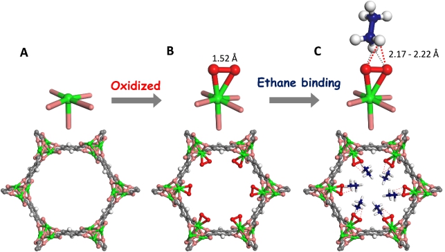 在本文中,研究者们利用氧分子先与Fe-MOF材料中的不饱和空位结合,有效阻挡不饱和金属空位与乙烯间的π键相互作用,显著降低乙烯吸附量。同时,新构建的Fe-O2基团能够与乙烷显示出更强的吸附亲和力,实现吸附乙烷强于乙烯,从而达到选择性脱除乙烯中杂质乙烷的目的。