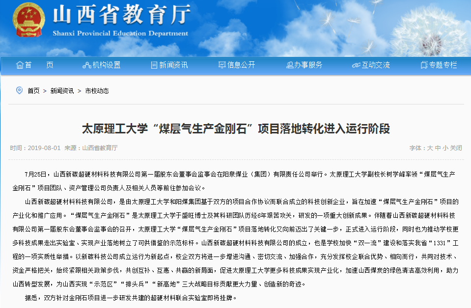 8月1日,省教育厅官网以《色情小說“煤层气生产金刚石”项目落地转化进入运行阶段》为题在“市校动态”栏目中报道我校“煤层气生产金刚石”项目最新进展。