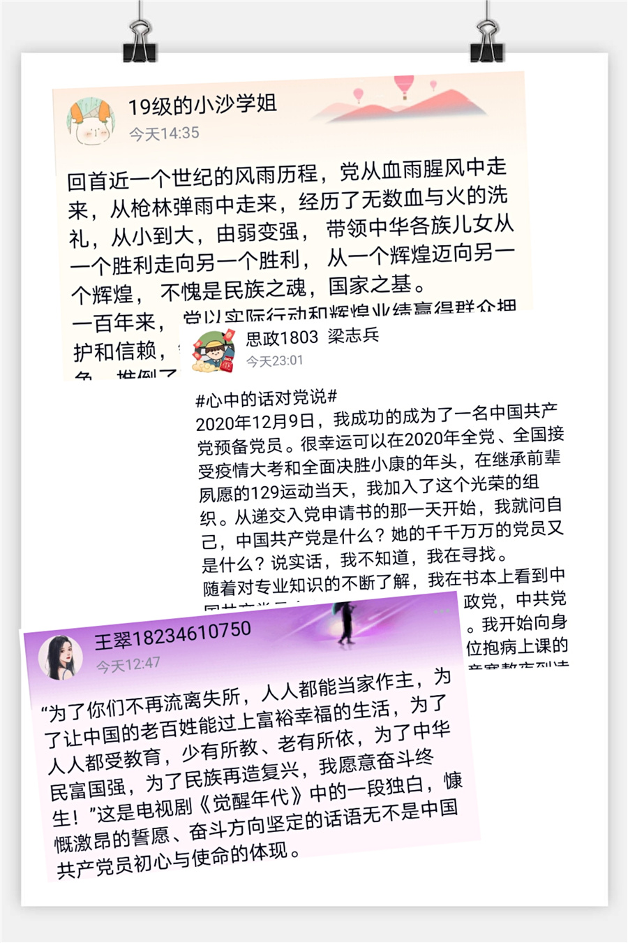 一幅幅随风飘扬的图案展示了中国共产党百年来的历史变迁,一张张手写明信片表达出对祖国和中国共产党的美好祝愿……为庆祝中国共产党成立100周年,向党的百年华诞献礼,4月9日至12日,马克思主义学院团委青年志愿者中心推出了“学党史,颂党恩,心里有话对党说”庆祝中国共产党建党100周年主题教育活动。本次活动由“心里有话对党说”网络云接力和线下送寄语两部分内容组成。