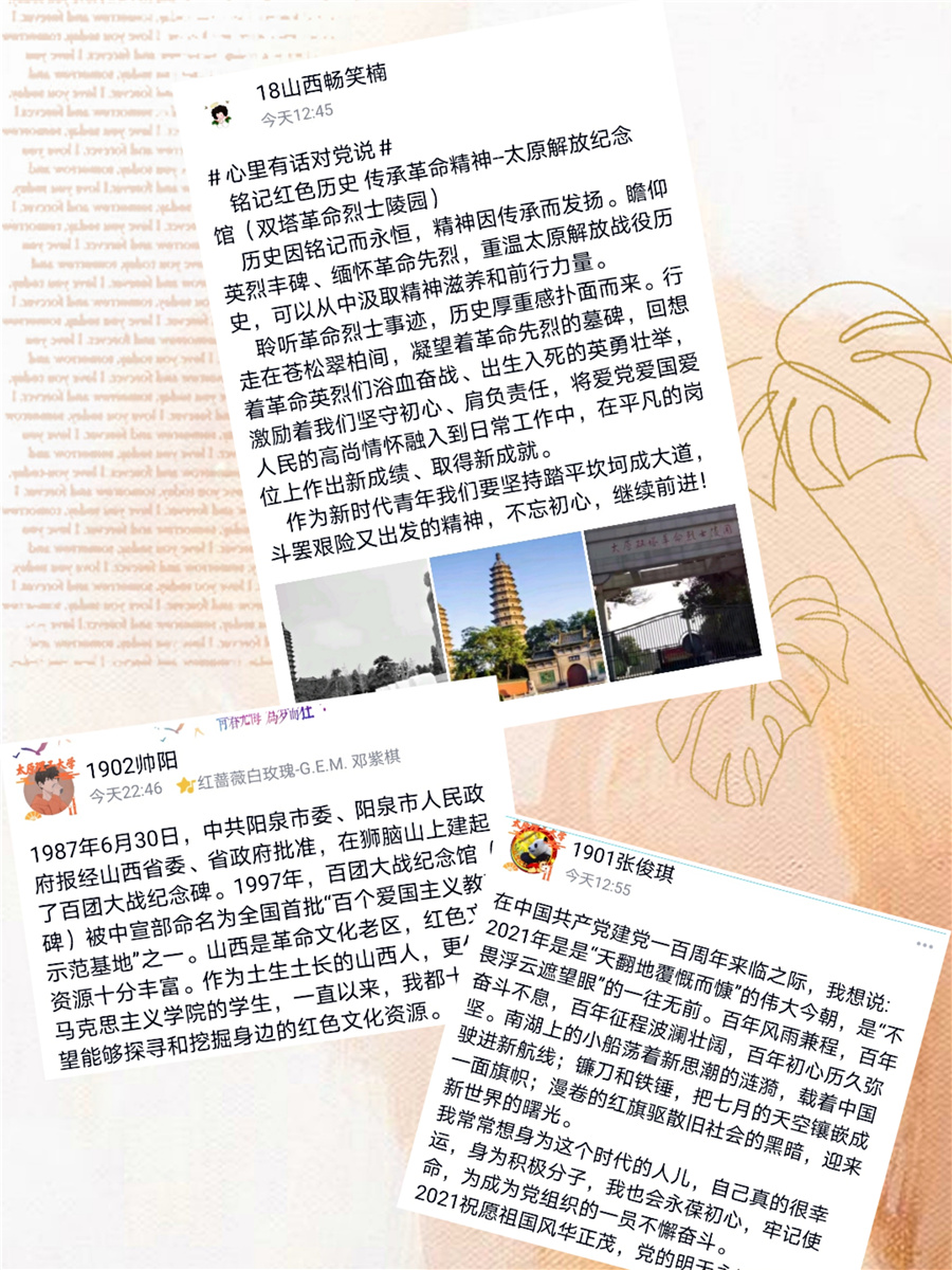 思想政治教育专业的同学们以QQ说说的形式进行网络云接力,记录了自己重走红色足迹、访谈红色人物、品读红色经典、观看红色电影的感触瞬间,并分享了自己对党的深厚感情和坚定信仰。同时,在学校明向校区西区广场,开展了“心里有话对党说”的线下寄语活动,吸引了广大师生们积极参与。在印有中国共产党百年历程的明信片上,大家写下了自己想对党说的“心里话”,传递了对党的真挚情感。同学们还用视频的方式记录下了自己的感触瞬间,并将感想分享给身边的朋友。
