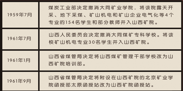 1958年,高等教育战线过快地发展,造成高等学校数量过多、规模过大、布局不合理。为此,煤炭工业部于1959年下半年对山西省境内新建的煤炭高校进行了一次整顿工作。