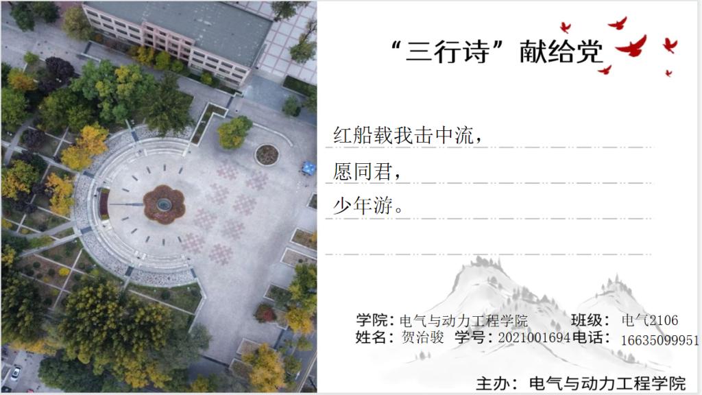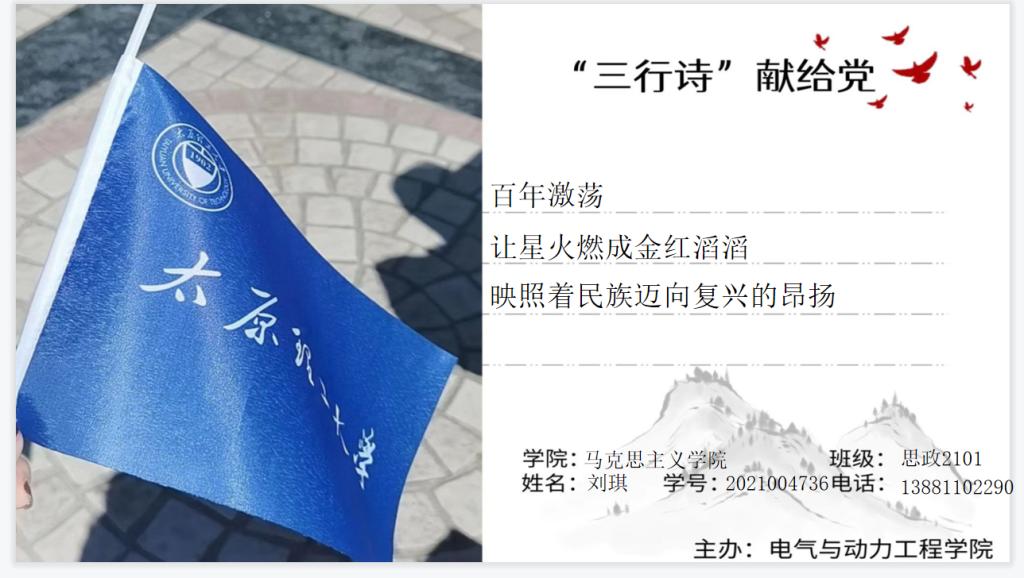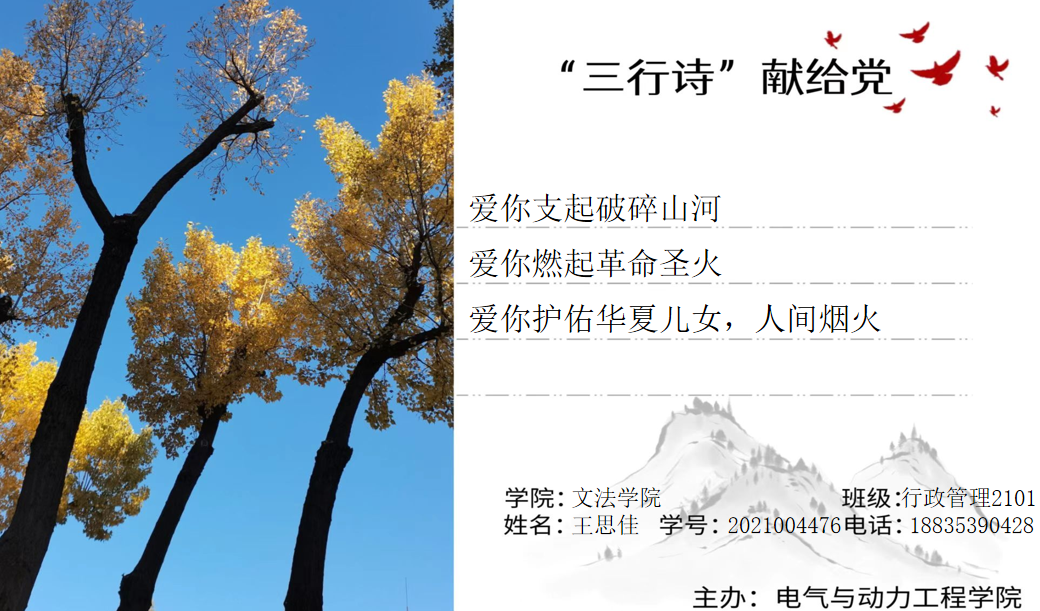 为了庆祝中国共产党第二十次全国代表大会胜利召开,激励和动员同学们为实现“两个一百年”奋斗目标、实现中华民族伟大复兴的中国梦凝聚起青春力量,电气与动力工程学院组织开展了“踔厉奋发,强国有我”献礼党的二十大“三行诗献给党”、“经典诵读献给党”、“创意海报献给党”、“师生祝福献给党”等系列活动。
