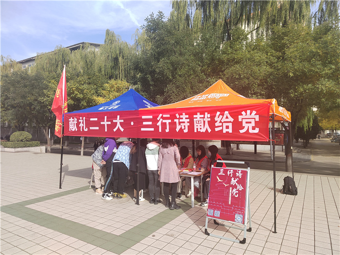 深情告白共“书”爱党情怀。在“献礼二十大,永远跟党走,奋进新征程”三行诗活动现场,同学们情绪昂扬,气氛热烈,纷纷写下对祖国的美好期盼和对中国共产党的深厚情怀,同时线上征集活动同步进行,共有十二个学院共400余名同学参与。