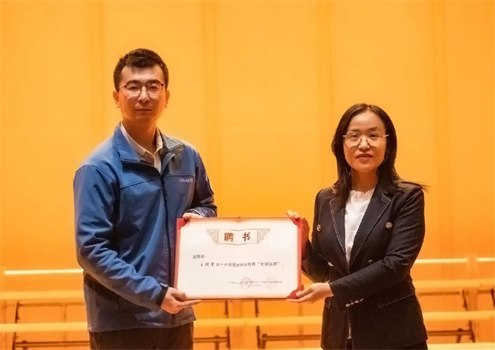 报告会最后,闫新作总结讲话,她鼓励全体学生向王煜尘学习,在追求梦想、科研报国的道路上踔厉奋发,做能吃苦、肯奋斗、跟党走的中国好青年,不负青春、不负韶华。她代表学院为王煜尘颁发了经济管理学院特聘“先锋讲师”聘书。