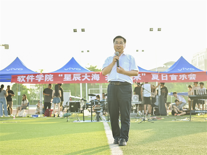 求实创新,韬奋钟声,曾带着我们共同的憧憬;青砖红瓦,碧波绿柳,曾铭记我们共同的回忆。在这个特别的盛夏,软件2020级学生将背负理想与行囊,向着星辰大海,共赴绚烂未来。6月28日晚,软件学院“星辰大海,共赴未来”夏日音乐会在明向校区西操场举办,在场师生欢聚一堂,共同感受这一美好难忘的时刻。校党委学生工作部部长赵国俊、校团委书记史薛伟、软件学院党委书记李栩、院长赵涓涓、党委副书记郭飞、副院长冯秀芳、曹锐以及学院师生参加晚会。
