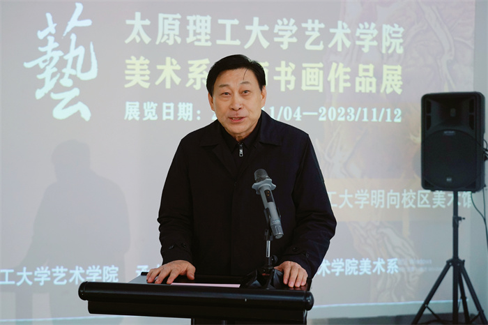 艺术学院副院长(主持工作)刘东霞致欢迎辞。她表示,本次展览展现了艺术学院美术、书法专业教师近年来创作的一批思想精深、艺术精湛的优秀作品,不仅是美术系悠久血脉传统的延续和创新理念的体现,更是学院以美术与书法专业硕士点获批为契机迎来的一次发展新开端。王学辉、石跃峰分别讲话,对艺术学院近年来在学科发展和专业建设方面所取得的成绩给予充分肯定,并勉励艺术学院全体师生再接再厉、矢志奋斗,接续为美术书法事业做出新的更大贡献。任喜莹宣布展览开展。