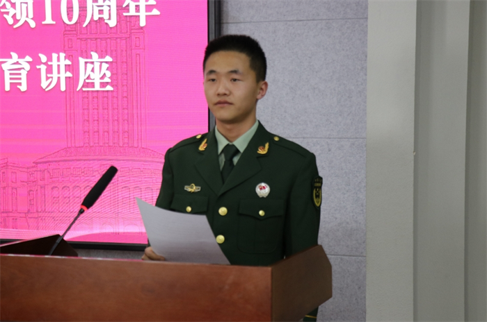 随后,退役复学学生代表刘瑶同学分享了他的入伍经历和在军队的成长故事,真实的历程和切身的感受激发了同学们报效祖国的热情,强化了使命担当,进一步理解了国防的重要性与国家安全的深刻内涵。刘瑶勉励大家要不断完善自我,早日成为国家的栋梁之才。