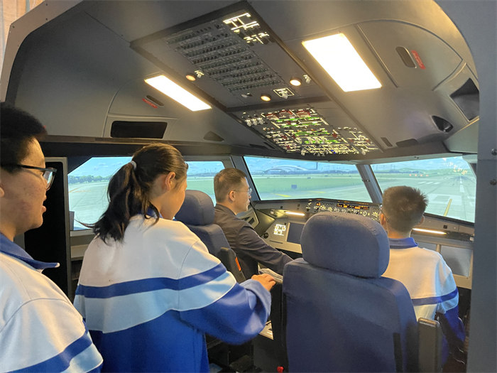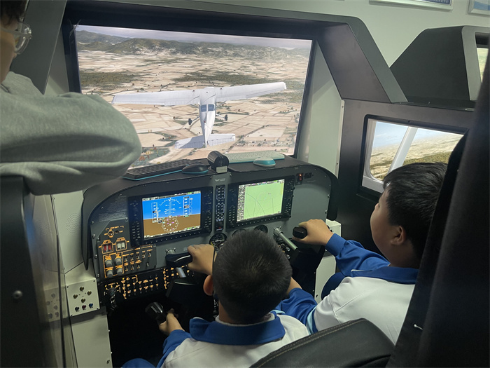 实验室开放活动中,同学们参观了赛斯纳-172机型和空客A320机型的飞行模拟平台,面对专业化的实验室设备,大家表现出浓厚的兴趣。指导教师向同学们科普了基本的航空仪表知识和飞行模拟器的操作要领。随后,在老师和科普志愿者的带领下,同学们沉浸式体验了飞行模拟平台的操作,深切感受翱翔天空的美妙。