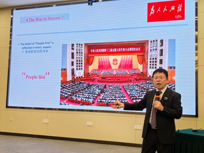 姚喜明教授以中国航天神州十八号和嫦娥六号及中国海军福建舰的热点时事为切入点,逐一列举了中国历年来的伟大成就;通过中西方对照的方式,形象展示了中国在政治民主、经济发展、文化繁荣、社会稳定和生态良好的突出成就,并带领国际学生回顾了中国近代史、新中国的建设及改革开放的历史进程。最后姚喜明总结道中国成功最重要的因素是中国共产党领导中国特色社会主义的治国之道。