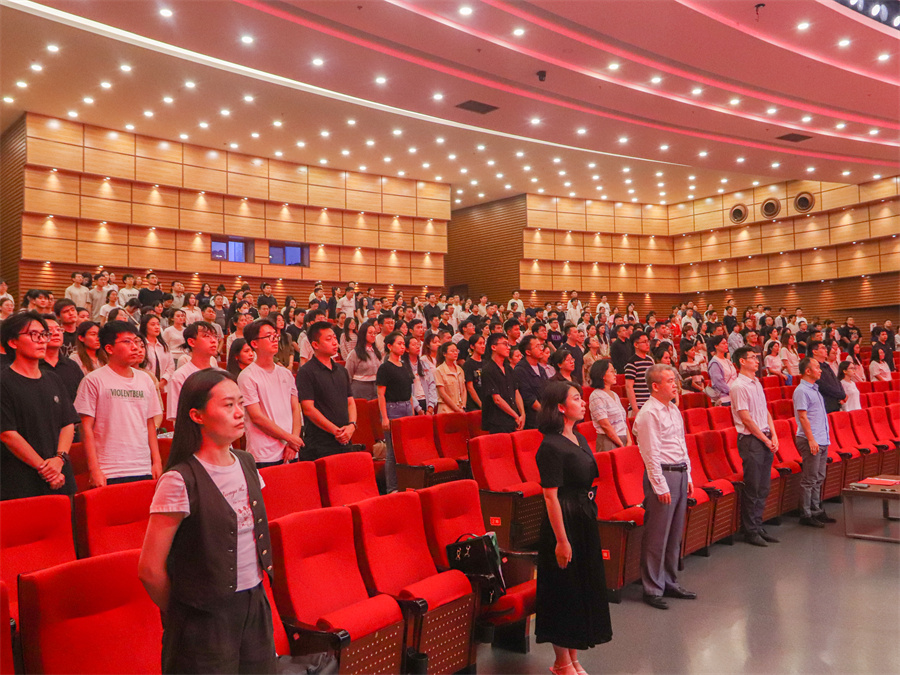 典礼在庄严的中华人民共和国国歌中拉开帷幕。陈怀超教授代表学院致辞。他对2025级新生的到来表示热烈欢迎,寄语新生要与导师互相促进、共同成长。他强调,科学规划是学业与人生成功的关键,鼓励同学们立足高远、脚踏实地。他以轻松诙谐的语气,围绕“如何进行有效的人生规划及解决个人难题”与同学们展开互动,迅速拉近了师生间的距离,现场笑声与掌声此起彼伏。