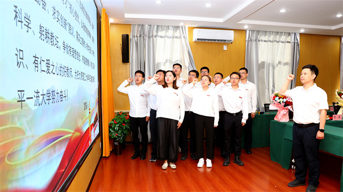 王涛带领新入职青年教师宣誓,并对荣休仪式进行总结。王院长介绍了机械工程学院“双一流”建设情况,对机械工程学院的未来发展做出展望。强调新入职老师要忠于党的教育事业,落实立德树人根本任务,为学院的发展努力奋斗;同时希望荣休教师继续关心支持学院发展,在学科建设、学术研究和指导青年教师方面继续发挥余热。