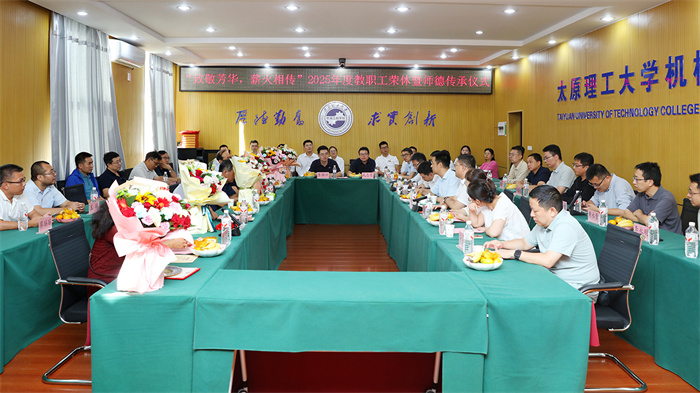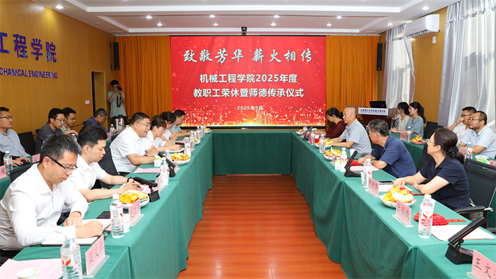 9月9日,机械工程学院2025年度教职工荣休暨师德传承仪式在机械馆二层第一会议室隆重举行。副校长王志华,机械工程学院党委书记武佐君,院长王涛,副书记李昱霞,副院长赵敬伟,院工会主席张晓俊,荣休教师代表,各系部中心、科室、工会负责人,教师代表和新入职教师代表参会。