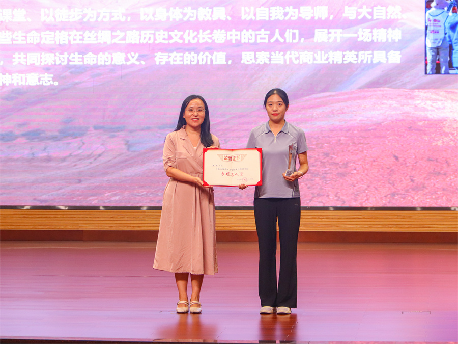 院党委书记闫新为解颖颁发专硕名人堂证书,以表彰其在赛事组织与MBA教育中所做出的杰出贡献。