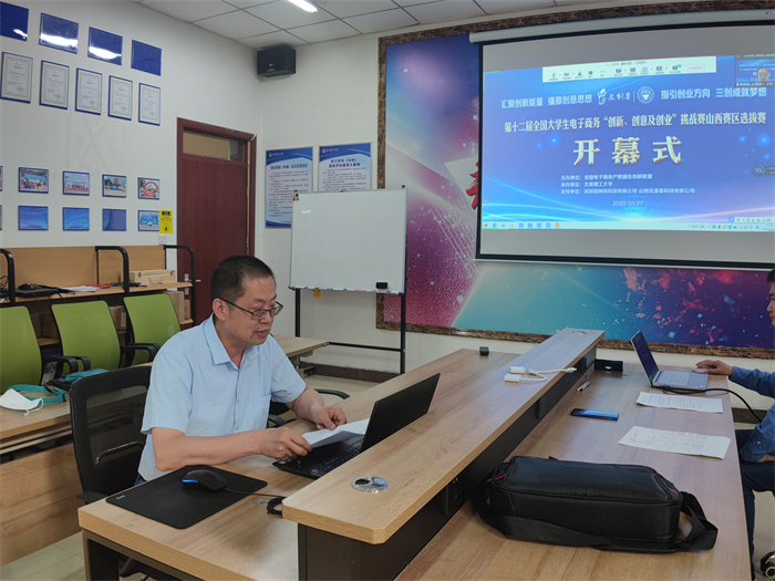 5月27日下午17:00,山西赛区选拔赛在雄壮的国歌中正式拉开帷幕。教育部高等学校电子商务类专业教学指导委员会委员、东北财经大学杨兴凯教授,教育部高等学校电子商务类专业教学指导委员会委员、首都经济贸易大学郭卫东教授,全国电子商务产教融合创新联盟副理事长单位、深圳因纳特科技公司胡强总经理,我校创新创业学院院长郭菲、经济管理学院院长栗继祖,以及来自全省高校、企业的专家评委等嘉宾出席开幕式,开幕式由经济管理学院党委副书记杨振东主持。