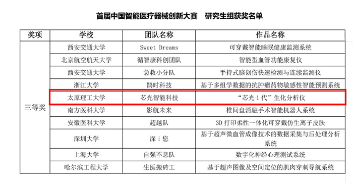 生物医学工程学院项目获首届中国智能医疗器械创新大赛三等奖