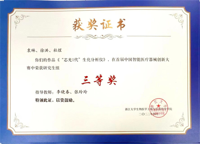 在首届中国智能医疗器械创新大赛中,我校生物医学工程学院芯光智能团队的参赛作品《“芯光1代”生化分析仪》进入了决赛,最终荣获三等奖。该团队于6月3日收到大赛颁发的获奖证书。