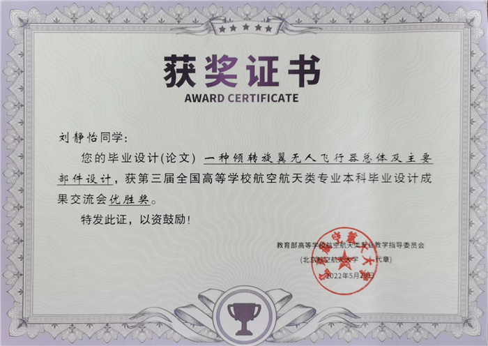 近日,在第三届全国高等学校航空航天类专业本科毕业设计成果交流会中,由我校航空航天学院教授李文辉指导、2022届本科毕业生刘静怡完成的毕业设计(论文)喜获优胜奖。这是学院自2019年底成立以来,培养的第一批本科毕业生首次参赛即获得此项荣誉,是在本科教育教学和人才培养方面取得的重大突破。